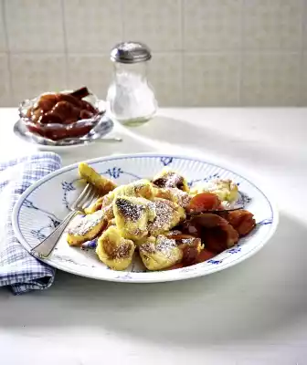 Beat the egg whites until very stiff and allow 40 g of sugar to trickle in. Fold the beaten egg white into the dough. Heat 2 tbsp. butter in a large pan. Add half of the dough and bake at medium heat from the bottom side until golden brown. Turn with the help of a large pallet, allow to set briefly. Then pluck the dough into pieces with 2 forks and dust with 1 tsp. icing sugar. Fry the dough pieces all around until golden brown. Keep warm in a preheated oven (50 °C). Do the same with the remaining dough, butter and 1 teaspoon icing sugar.