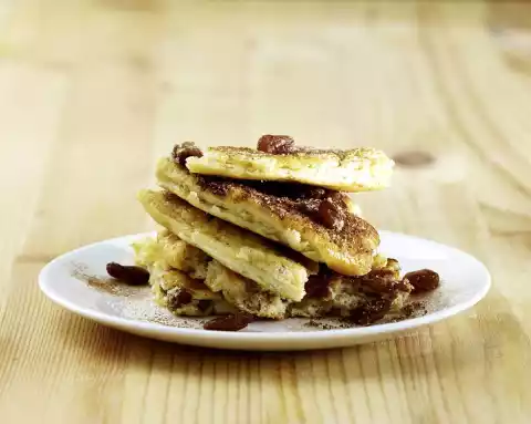 Remove the finished Kaiserschmarrn from the pan and keep warm. Bake the rest of the dough in the same way. Arrange the pancakes on plates, sprinkle with raisins and cinnamon-sugar.