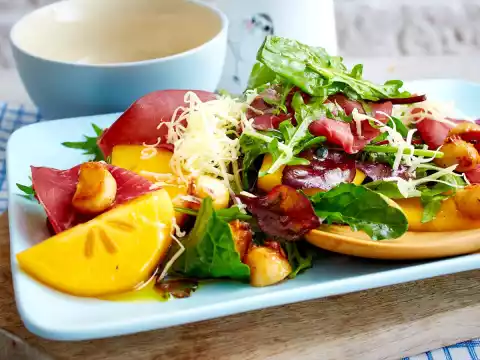 Mix vinegar with 2 tablespoons of maple syrup, salt and pepper. Fold in the oil. Mix salad with kaki and Bündner meat, sprinkle with the vinaigrette. Sprinkle with nuts and cheese.
