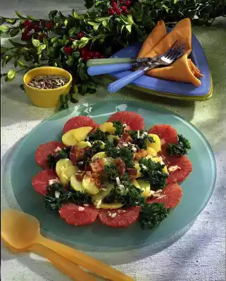 Put bacon on a plate, remove pan from heat. Put onion cubes, grapefruit juice, vinegar and remaining oil in the hot pan and season with salt and pepper. Stir well and mix with potatoes and kale.
