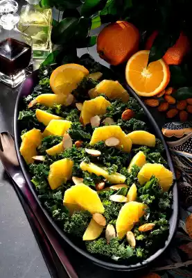 Wash the potatoes and cook in boiling salted water for about 20 minutes. Wash kale thoroughly, drain and cut into fine strips. Peel two oranges generously so that the white skin is completely removed. Halve the oranges and cut them into slices. Halve the almonds. Squeeze the remaining orange.