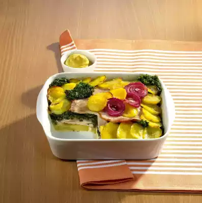Fry the onions for about 2 minutes, remove some onion rings. Put the kale into the pot, pour 1/8 litre stock, bring to the boil and cook for about 5 minutes. Season with salt and pepper. Melt 30 g fat in a pot. Sweat flour in it. Deglaze with 1/4 litre stock and milk while stirring. Bring everything to the boil and simmer at low heat for about 3 minutes. Stir in mustard and season with salt and pepper. Grease an ovenproof dish. Layer sauce, potato slices, kale and slices of sliced pork alternately in the tin. Finish with potato slices and the remaining onion rings.