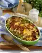 Deglaze with 1/4 litre stock and milk while stirring. Bring everything to the boil and simmer at low heat for about 3 minutes. Stir in mustard and season with salt and pepper. Grease an ovenproof dish. Layer sauce, potato slices, kale and slices of sliced pork alternately in the tin. Finish with potato slices and the remaining onion rings. Put 30 g fat in flakes on top and sprinkle with sugar. Bake in a preheated oven (electric cooker: 200 °C/ convection oven: 175 °C/ gas: level 3) for approx. 30 minutes.