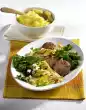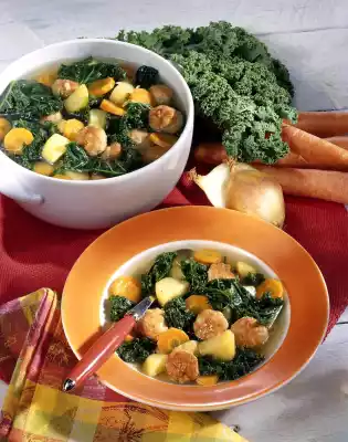 After about 30 minutes add to the kale. Heat the oil in a pan. Press the sausage mixture into the pan to form small dumplings from the skin. Fry the dumplings all around until golden brown. Add the dumplings to the kale shortly before the end of the cooking time.