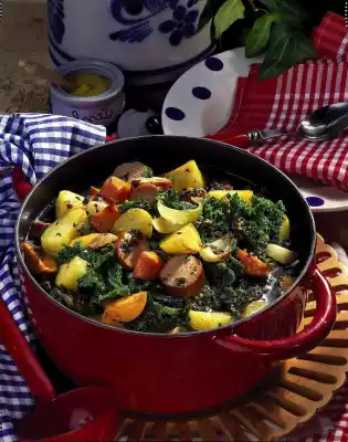 Add remaining lard. Sauté the kale for 10 minutes while turning and season with salt and pepper. Deglaze with broth and braise covered for about 40 minutes. Add onions, potatoes, carrots and mustard seeds after about 20 minutes cooking time. Cut the sausage into slices. During the last 10 minutes of cooking time heat up in a kale pot. Season again and serve