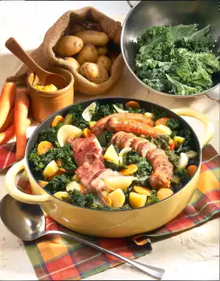 Peel and wash the potatoes. Grate 2 potatoes finely and stir into the kale. Cut remaining potatoes into large pieces. Peel and slice the carrots. Add potatoes and carrots to the kale and cook for about 1 hour.