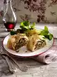 Sprinkle the dough with breadcrumbs. Spread the kale mixture on top, leaving a rim of about 2 cm all around. Place the side edges of the dough over the cabbage. Roll up firmly from the bottom side using the cloths.