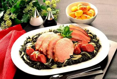 Add cured pork and cooked sausages and cook for another 15 minutes. Remove pork cheek and cooked sausage, cut into slices. Season the kale with salt, pepper and sugar and arrange on a plate with the meat and sausage.