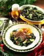 Clean the kale, wash thoroughly and blanch in boiling salted water. Drain and cut coarsely. Dice bacon finely. Peel onions and cut into slices. Heat 30 g clarified butter.