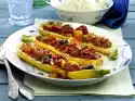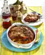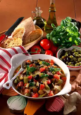 Clean, wash and chop the celery and aubergine. Peel onions and garlic. Dice onions gron, crush garlic finely. Clean and blanch the tomatoes and peel the skin. Cut tomatoes into cubes.