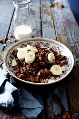 Spread the muesli evenly on the trays. Bake one after the other in a hot oven for about 20 minutes. Remove from the oven and let it cool down. Pour into a large sealable jar or a tin. Crunch with milk or yoghurt and fruit.