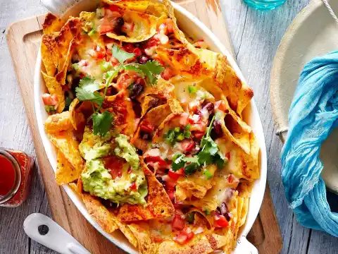 Rinse and drain the beans. Spread the chips in a large flat casserole dish. Peel the onion. Wash the tomatoes. Clean and wash the peppers.