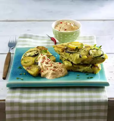Wash the potatoes, cook in boiling water for about 20 minutes, remove and rinse. Wash and clean the zucchini and cut them into thin slices. Peel potatoes, cut into slices