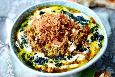 Traditionally, this recipe uses kashk, a dried yoghurt that is stirred with water to make a white sauce.