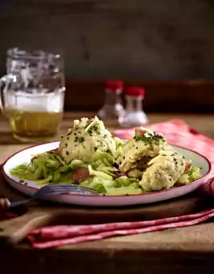 Bring salt water to the boil. Shape cheese dumpling dough into dumplings and let them simmer in boiling water for about 10 minutes. Bring salted water to the boil in a 2nd pot. Blanch cabbage in it for 3-4 minutes, drain in a sieve. Swivel in the hot bacon fat for about 1 minute. Season with salt and pepper. Fold in bacon. Garnish with grated cheese and chive rolls