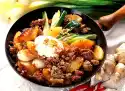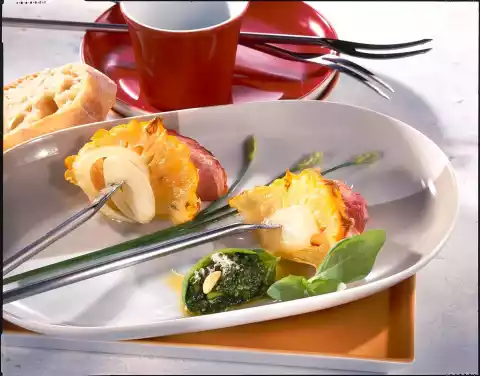 Peel, halve and slice the pineapple. Peel onions, cut into thick slices. Wash the cured pork, cut into thin slices. Skewer prepared ingredients and cook in lightly boiling broth for 3-4 minutes.