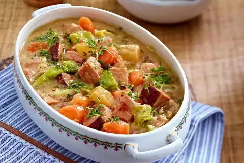 For the goulash, peel, wash and cut carrots into pieces. Clean, wash and cut cabbage into wide strips. Wash the smoked pork, dab dry and cut into cubes.