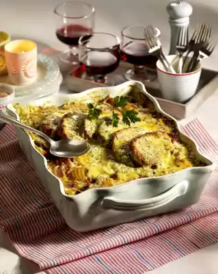 Pour cream over the potatoes and close the mould tightly with aluminium foil (or a lid). Cook in the preheated oven (electric cooker: 200 °C/ convection oven: 175 °C/ gas: level 3) for approx. 1 1/2 hours.