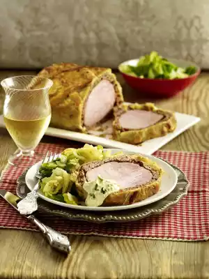 Cut smoked pork loin into slices and serve with butter savoy cabbage and sour dip.