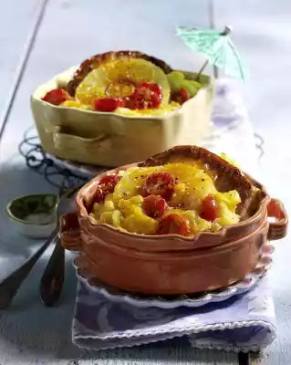 Drain the pineapple. Wash and halve the tomatoes. Boil up milk and butter. Drain potatoes. Add milk to the potatoes and mash to puree. Divide the mashed potatoes into 4 small ovenproof cups.