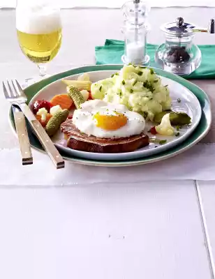 Arrange mashed potatoes, 1 cutlet and mixed pickles on plates. Put 1 fried egg on each cutlet. Sprinkle mashed potatoes with chives