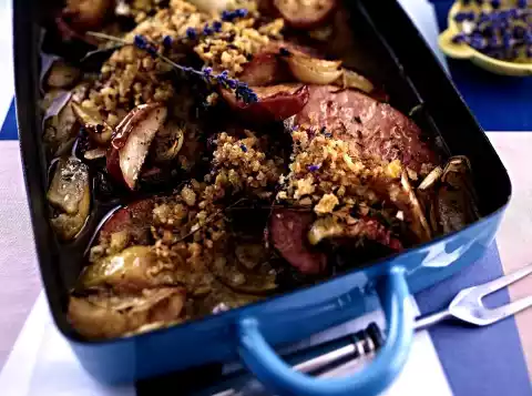 Remove foil. Sprinkle crumbs over the meat. Bake in the oven at the same temperature for about 15 minutes. Serve garnished with lavender