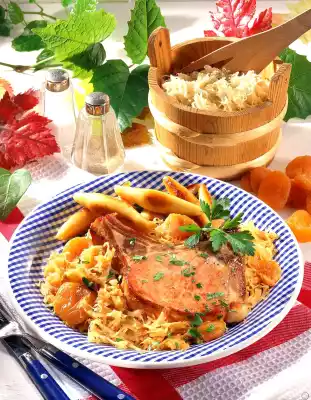 Remove from the pan, add the sauerkraut and braise vigorously. Add apricots with the apple juice and stock, place chops on the cabbage and braise covered for about 15 minutes. Wash the parsley, dab dry and cut into strips except for a little garnish.