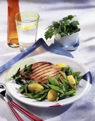 Fry the chops for 3-4 minutes on each side. Season with pepper. Season vegetables with salt and pepper. Arrange the cutlet with the potato and bean vegetables on a plate. Serve garnished with parsley.