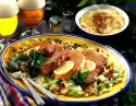 Peel and finely chop the onion. Wash and quarter apples and remove core. Cut the flesh into pieces and sprinkle with lemon juice. Heat oil. Sauté the cutlet on each side for 3 minutes. Add onion and apple pieces. Fry for about 5 minutes together.