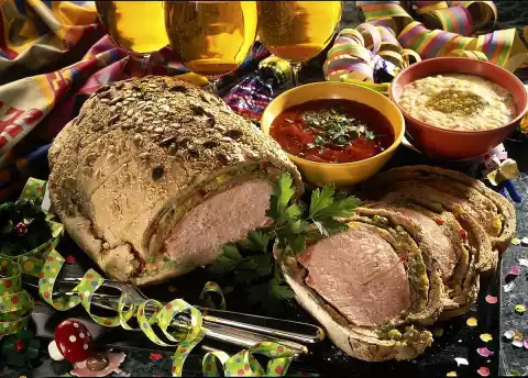 Then roll out to a plate of 30x50 cm. Spread the sausage meat mixture on top. Wrap meat in it. Brush with a little water. Sprinkle the surface of the dough with the remaining seeds. Bake on a floured baking tray in a preheated oven (electric: 200 °C/ gas: level 3) for about 45 minutes. Serve with relish refined with crème fraîche and chilli sauce sprinkled with parsley