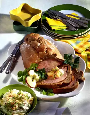 Roll out about 2/3 of the dough into a rectangle on some flour. Whip the cured pork in it. Brush the edges with water and press on. Place them with the seam facing down on a baking tray lined with baking paper. Form 3 thin strands from the rest of the dough and braid into a plait. Brush the surface of the bread with water, place the plait on top and press it on. Cover and leave to rise for a further 30 minutes.