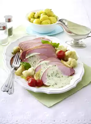Cut the meat open. Arrange on a plate with vegetables, stock and some sauce. Garnish with basil. Add the rest of the sauce. Boiled potatoes taste good with it.