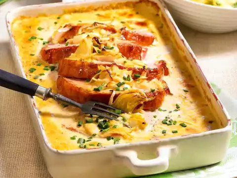 Onions peel, halve and cut into thin slices. Wash and dry the cured pork loin. Fry in 1 tablespoon of hot oil for 1-2 minutes on each side. Season with pepper. Take out and put into a lightly oiled casserole dish (approx. 30 cm long)