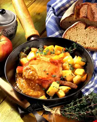 Add apple pieces and 2/3 of the thyme to the meat and fry over medium heat for 6-8 minutes. Season the apple cubes with salt. Remove meat and apple cubes from the pan. Add mustard, soy sauce and 6 tablespoons of water to the pan, bring to the boil and season to taste. Slide the sauce to one side and arrange the cutlet and apple cubes, sprinkled with thyme and garnished, in the pan. Crusty bread tastes good with it