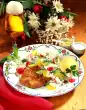 Washing apples. Cut the fruit flesh in wide gaps from the core. Dice the slices and sprinkle with lemon juice. Wash the cutlet and pat dry. Fry in lard on both sides and season with salt and pepper. Wash and pat dry the zhyme and, except for a little garnish, pluck off the leaves.