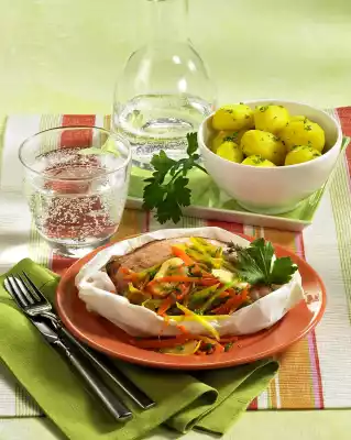Place the cured pork slices on top. Sprinkle with thyme and pepper. Close the packet and cook in the preheated oven (electric cooker: 200 °C/ convection oven: 175 °C/ gas: level 3) for 25-30 minutes. Peel and wash the potatoes and cook in boiling salted water for about 20 minutes.