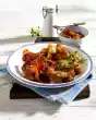 Crumble toast finely in the universal chopper. Mix bread, herbs and 1 egg and season with salt and pepper. Slightly moisten 5 puff pastry sheets with cold water, place them on top of each other and roll out to a square (approx. 35 x 35 cm). Sprinkle one side of the dough with breadcrumbs along the length of the pork loin. Spread the herb mixture over the meat and press down well. Place the smoked pork loin on the breadcrumbs and fold into the dough. Separate the rest of the egg. Brush the edges of the dough with egg white and press down well. Place the cured pork on a baking tray lined with baking paper with the seam side down. Roll the rest of the sheet slightly flatter and cut out blossoms and leaves as desired. Brush some of the flowers with egg white and stick them on the Kasselerbraten. Bake in the preheated oven (electric cooker: 200 °C/ gas: level 3) for about 30 minutes. Cook potatoes in little boiling salted water for about 20 minutes. Chop the remaining onions coarsely. Heat 20 g fat in a pan and sauté the onions in it. Add the sauerkraut and braise well. Drain the pineapple and collect the juice. Cut the rings into pieces.