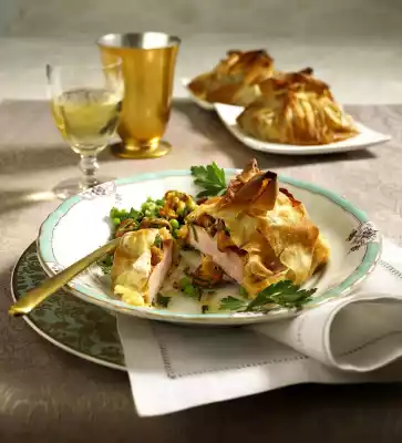 Place one leaf on the work surface. Brush with a little butter and place the 2 sheets on top, turned 90 degrees. Cut the strudel sheets in half crosswise to make 2 pastry sheets. Place 1 piece of meat on each pastry sheet, add 1 tablespoon of chanterelles on each one, and a dash of crème fraîche on each one. Take the dough ends up and press them together to form a sweet. Place on a baking tray lined with baking paper. Process the rest of the strudel dough, meat, 1 tablespoon of chanterelles and crème fraîche in the same way. Brush with remaining melted butter and bake in a preheated oven (electric range: 200 °C/ convection oven: 175 °C/ gas: level 3) for 10-12 minutes. In the meantime, put peas in 125 ml boiling salted water, bring to the boil, cover and cook over medium heat for about 3 minutes. Then drain, drain well. Heat the remaining chanterelles, 2 tablespoons of butter and peas, season with salt and pepper. Arrange the smoked pork loin in a strudel leaf and vegetables on plates garnished with parsley