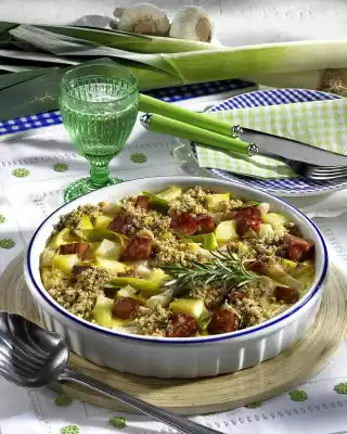 Clean, wash and halve the leek and cut into wide diagonal strips. Dice the smoked pork. Heat oil in a pan. Fry the meat on all sides until golden brown. Add the leek and fry briefly.