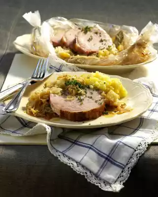 Wash the cured pork, dab dry. Season with pepper and place on the cabbage. Close the roasting tube and cut in at the welding seam about 1 cm