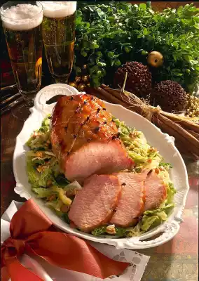 Clean the savoy cabbage, wash it, quarter it, cut out the stalk. Cut cabbage into strips. Mix honey and mustard. Take meat out of the stock and let it cool down a bit. Cut the surface of the roast into a 3 mm deep groove.