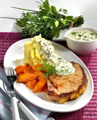 Fry the cured pork loin for about 2 minutes on each side. Remove and keep warm. Sauté the onion and garlic in the frying fat. Deglaze with broth. Add sour cream and stir until smooth. Bring to the boil and let it boil down for about 5 minutes. Peel, wash and slice the carrot. Cook carrot in boiling salted water for about 5 minutes. Stir the herbs into the sauce and warm it up. Season with salt and pepper. Drain potatoes and let them evaporate.