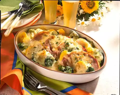 Add cream and 1/2 l vegetable water bit by bit and bring to the boil. Add half of the cheese and let it melt. Season sauce with salt and pepper. Cut the potatoes in half if necessary and put them in a shallow casserole dish with the broccoli.