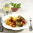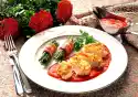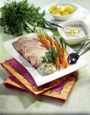 Cook the potatoes in salted water for about 20 minutes. Cook the carrots in lightly salted water for about 10 minutes. Remove meat from the stock and cut into slices. Arrange on a plate with carrots, potatoes and some sauce. Serve the rest of the sauce and potatoes with it. Garnish with herbs