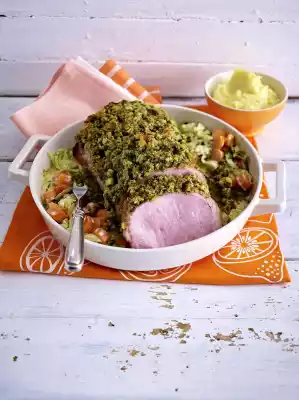 Wash the meat and dab dry. Put them in a large roasting pan spread with oil or on the oiled fat pan of the oven. Spread the crust of the breadcrumbs over the roast, press them on. Roast in a preheated oven (electric cooker: 175 °C/circulating air: 150 °C/gas: level 2) 1 1⁄4 -1 1⁄2 for hours.