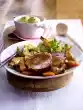 Season vegetables again with salt and pepper. Cut the roast open, arrange with vegetables and puree. Drink tip: rosé wine, e.g. a Côtes de Provence.
