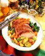 Dice bacon and leave it in a pot without fat. Add cabbage and apples and fry briefly. Add 1/8 litre water and wine and braise for 35-45 minutes. Season cabbage with sugar and salt. Wash parsley, dab dry and chop. Peel onion and chop finely. Mix onion, mustard and half of the parsley. Brush the roast about 15 minutes before the end of the cooking time. Remove the roast from the fat pan at the end of the cooking time, pour the meat through a sieve and fill up to 400 ml with water. Bring to the boil and stir in the sauce thickener. Stir in sour cream, season with salt and pepper. Arrange roast and cabbage on a plate.