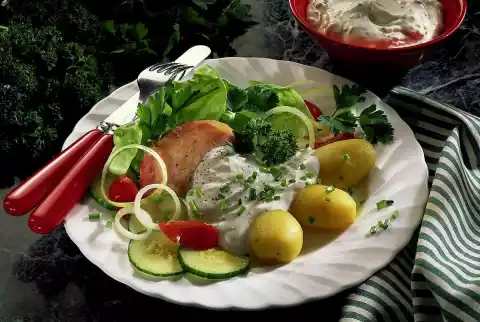 Peel and finely chop the garlic. Stir the herbs and garlic into the yoghurt. Season to taste with salt and pepper. Drain and peel the potatoes. Arrange everything together with the salad leaves on plates and garnish with parsley.