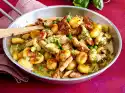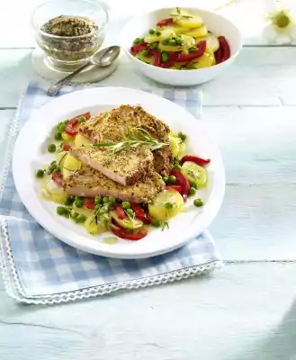 2) Bring 150-200 ml water and herb butter to the boil. Stir in stock. Add potatoes and rosemary, cover and steam for 18-20 minutes. Add peas and peppers about 3 minutes before the end of cooking time and steam. Season with salt and pepper. Wash the Kasseler, dab dry