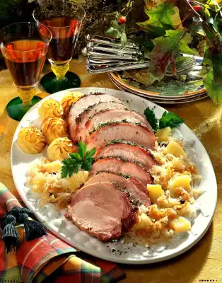 Take the roast out of the oven and let it rest for about 15 minutes wrapped in aluminium foil. Bake the Duchess potatoes in the preheated oven (electric oven: 200 °C/ gas: level 3) for about 10 minutes until golden brown. Arrange roast with sauerkraut and potato crown on a plate.